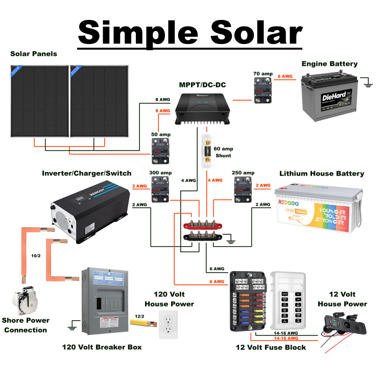This Solar Setup has only 6 major components: 400watts of Solar Panels, A 50amp combination Charge Controller and DC-DC Charger, a 300amp hour Lithium Battery, a 3000watt combination Inverter/Charger/Transfer Switch, a 12 volt Fuse Block, and a 120 volt AC Breaker Box. - In addition, you will want a 12 volt Distribution Block, some in-line DC Breakers, wire, connectors, and your 12 volt and 120 volt sockets/receptacles. - We will tell you the sizes as we go.